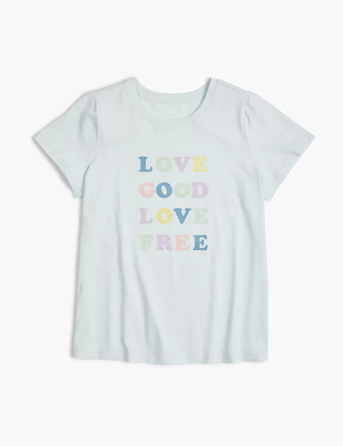 Spread good vibes in this classic fit tee featuring a perfectly colorful, distressed “Love Good Love Free” graphic.
