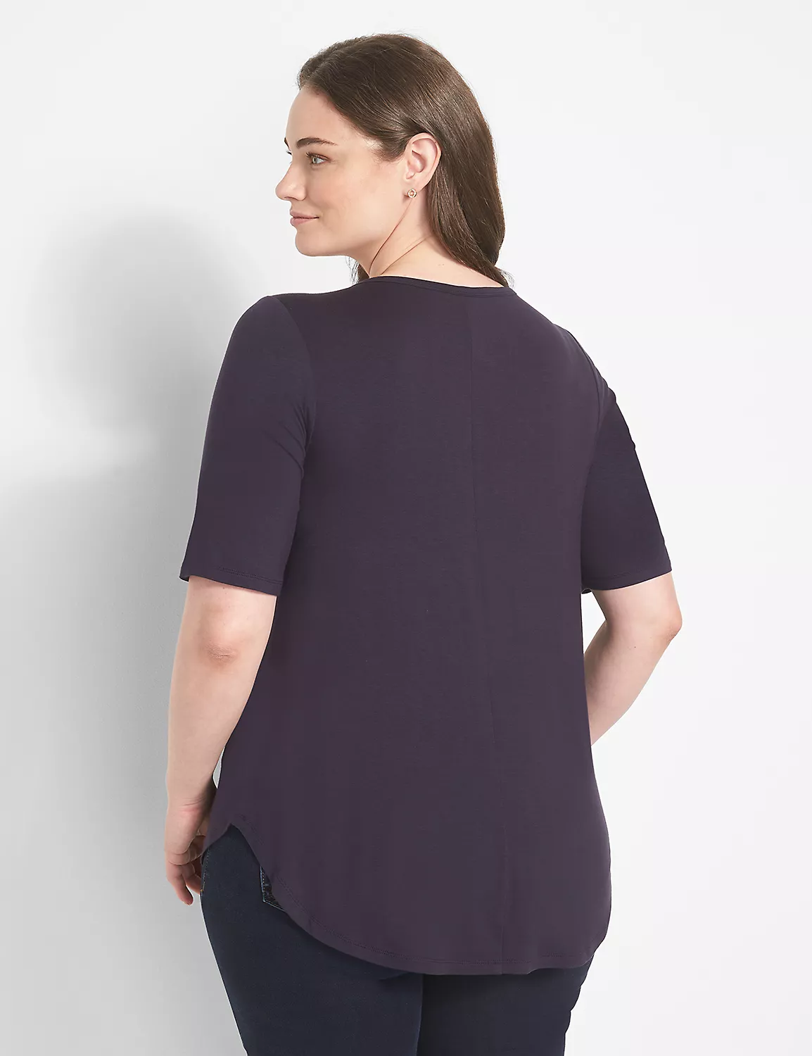 Open crew neck. Perfect Sleeves (slightly longer short sleeves for more coverage and total comfort). Curved hem. Jersey knit. Standard length. Available in extended lengths.
