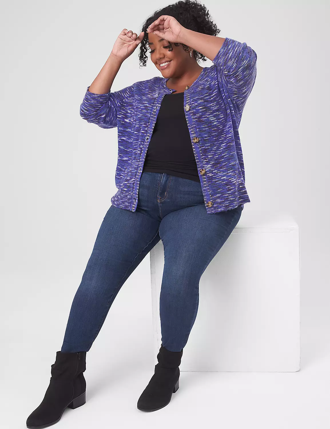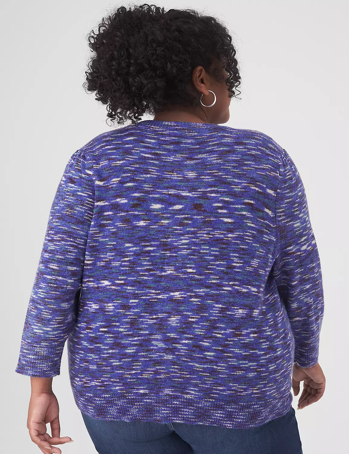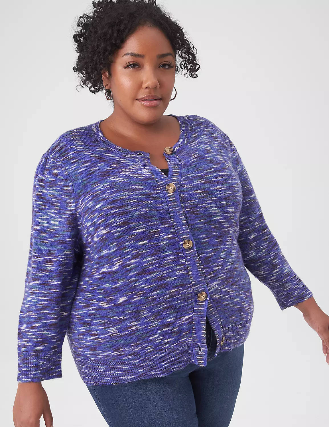 A classic fit cardigan with properly pretty details — puff-sleeves, a button front and spacedye print.