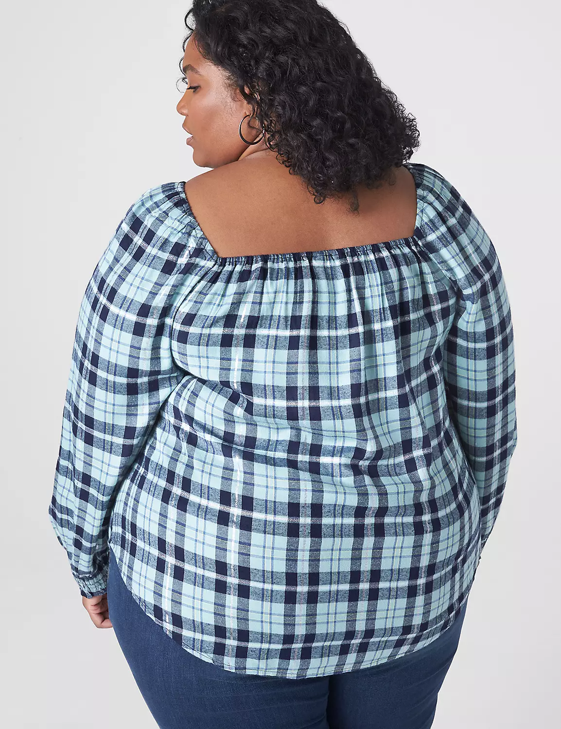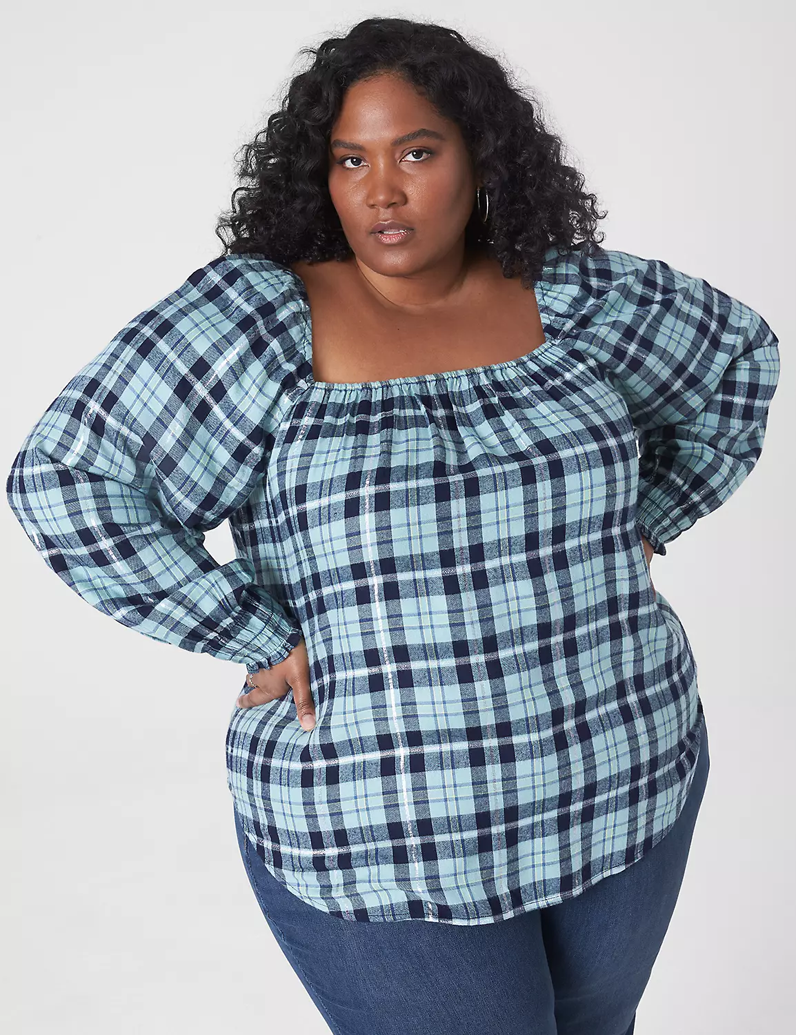 Square-neck top in pretty plaid with striking gathered sleeves. With jeans, it’s casual-chic perfected. With a faux-leather skirt and heels, it’s date-night ready.