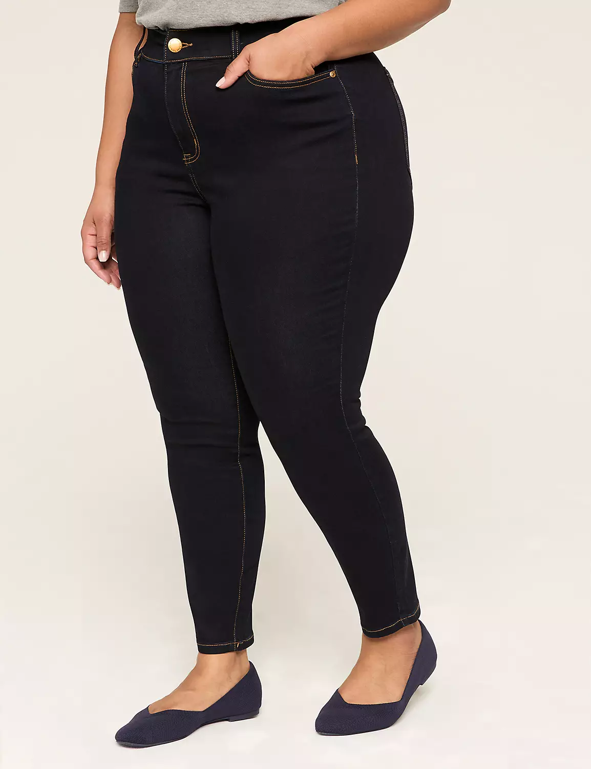 A soft and stretchy Curvy Fit high-rise sateen skinny jean in a streamlined dark wash. Belt loops. Five pockets. Button and zip-fly closure.