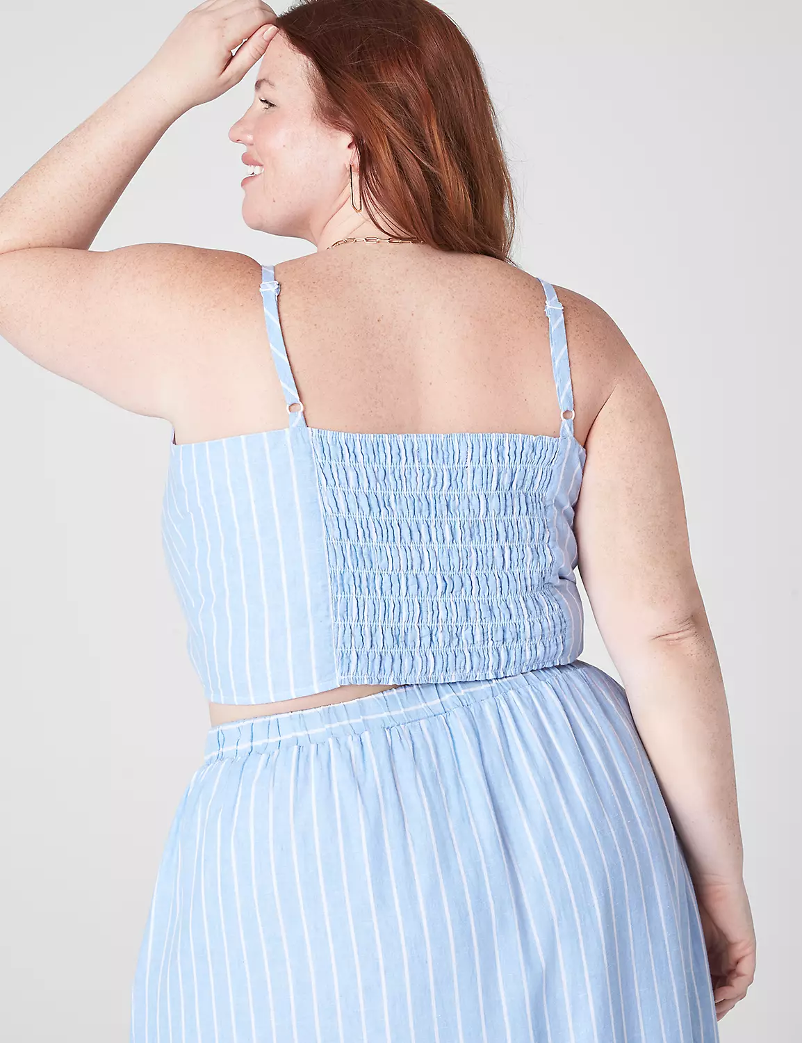 Sweetheart neck. Sleeveless. Adjustable straps. Princess seams. Lined through body. Elastic smocking at back. Linen and cotton blend fabric. Crop length.