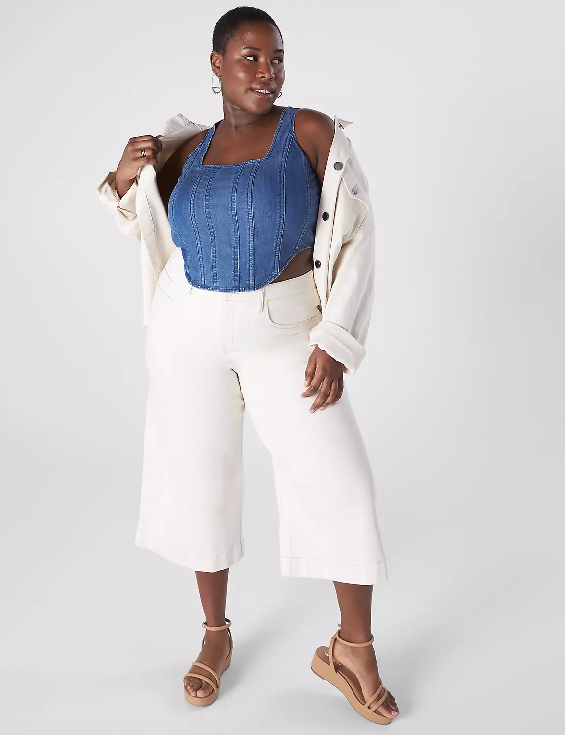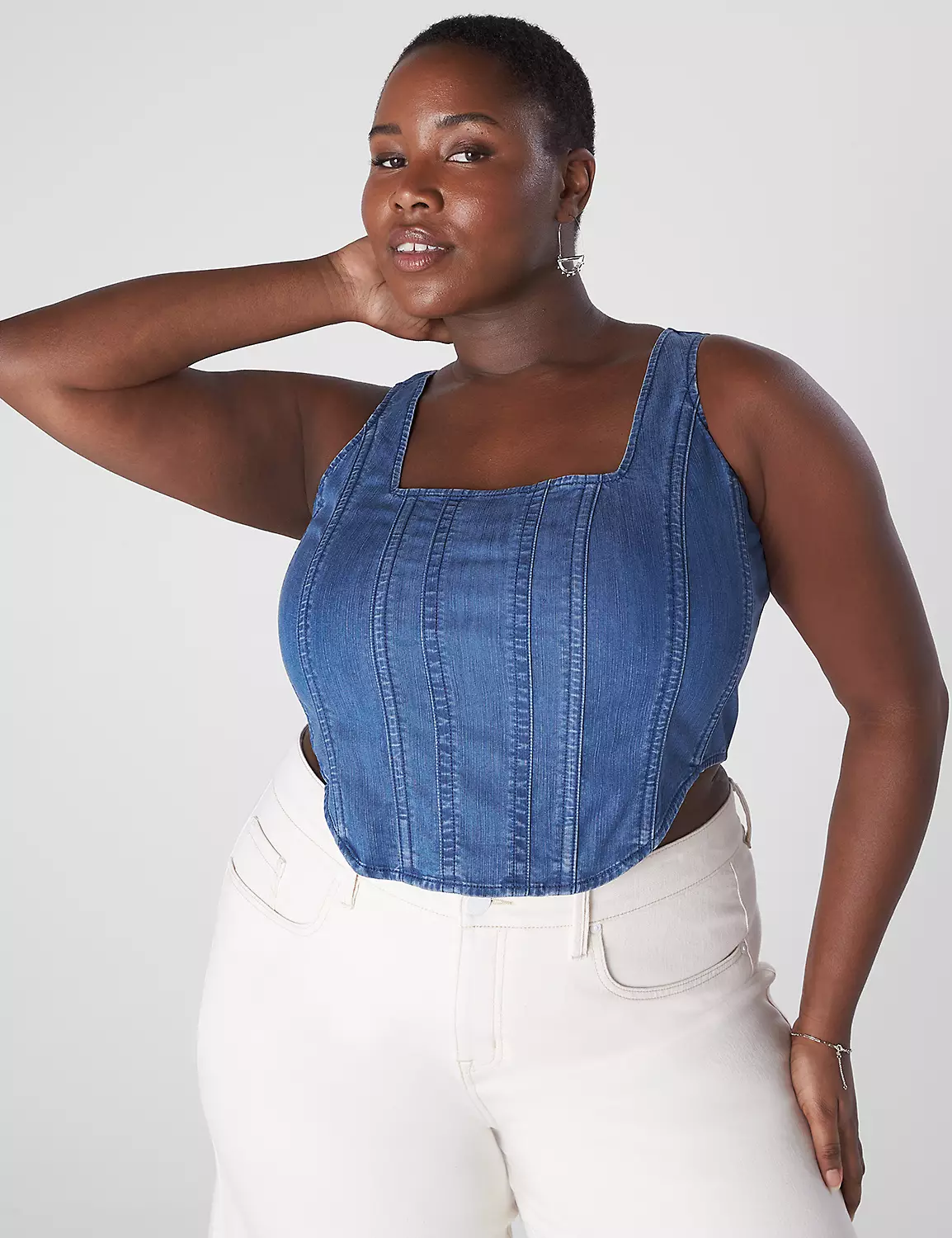This fitted bodice with silhouette-defining seaming and edgy-cool chambray totally nails the lingerie-inspired streetwear vibe.