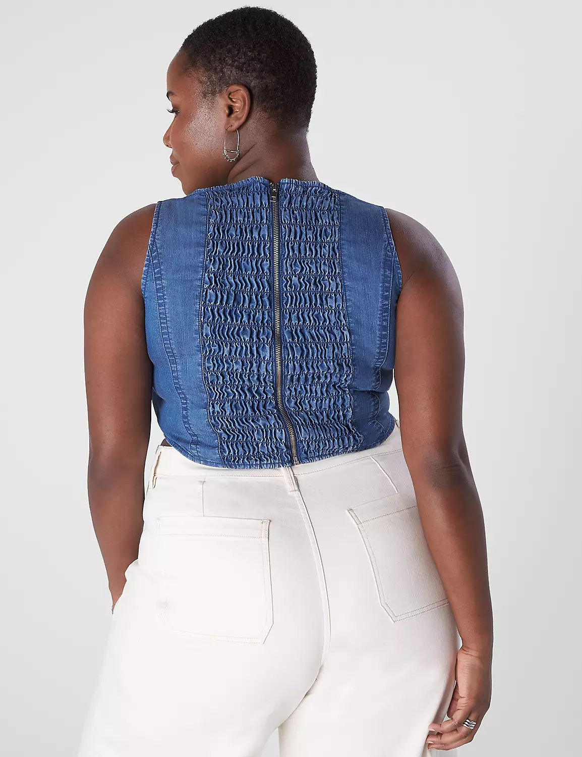 Square neck. Sleeveless. Chambray fabric. Cropped length. Smocked panel at back with zipper.
