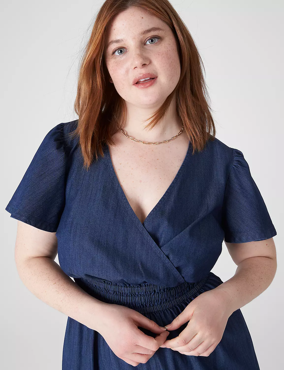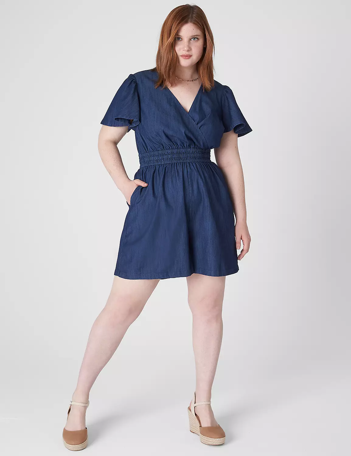 Surplice neck. Short flutter sleeves. Pockets. Smocked elastic waist. Stretch denim fabric. Single-button keyhole back closure.