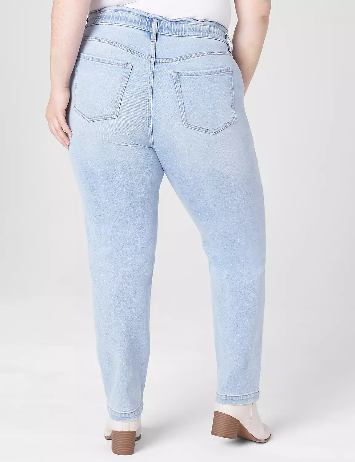 The paperbag elastic waist of these high-rise girlfriend jeans ensure all-day comfort & ease (plus endless compliments). Belt loops. Pockets at side seams and back. Button and zip fly closure.