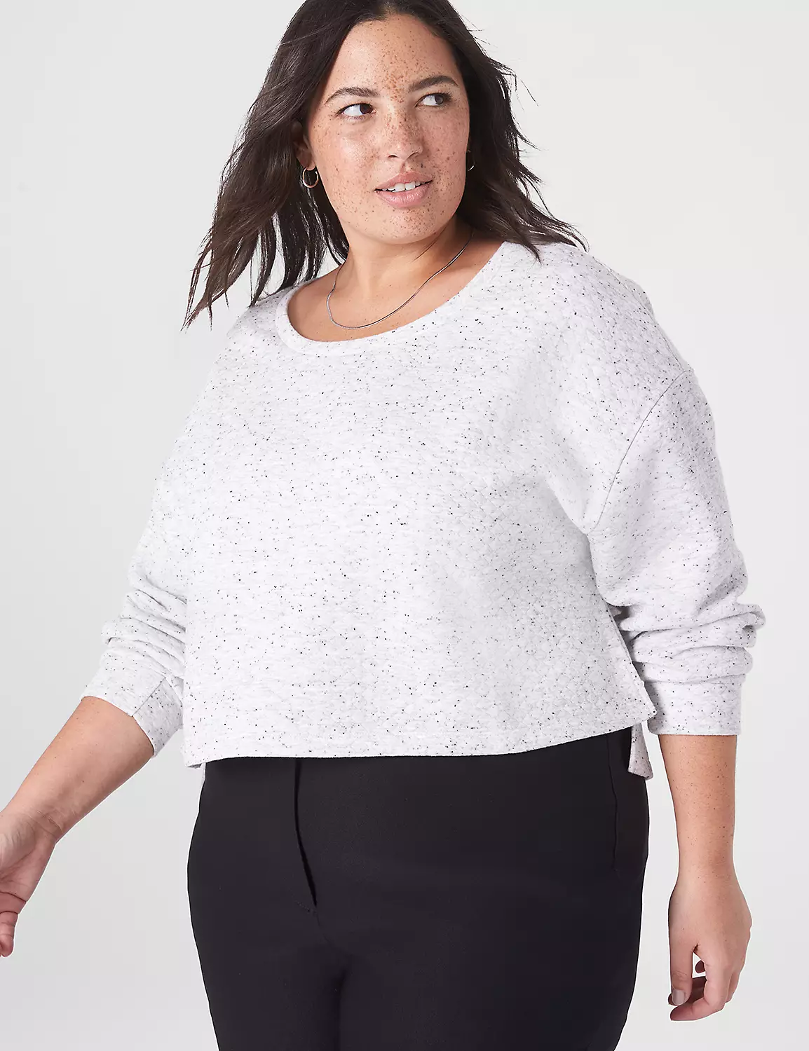 Crew neck. Long sleeves. Quilted fabric. Cropped.