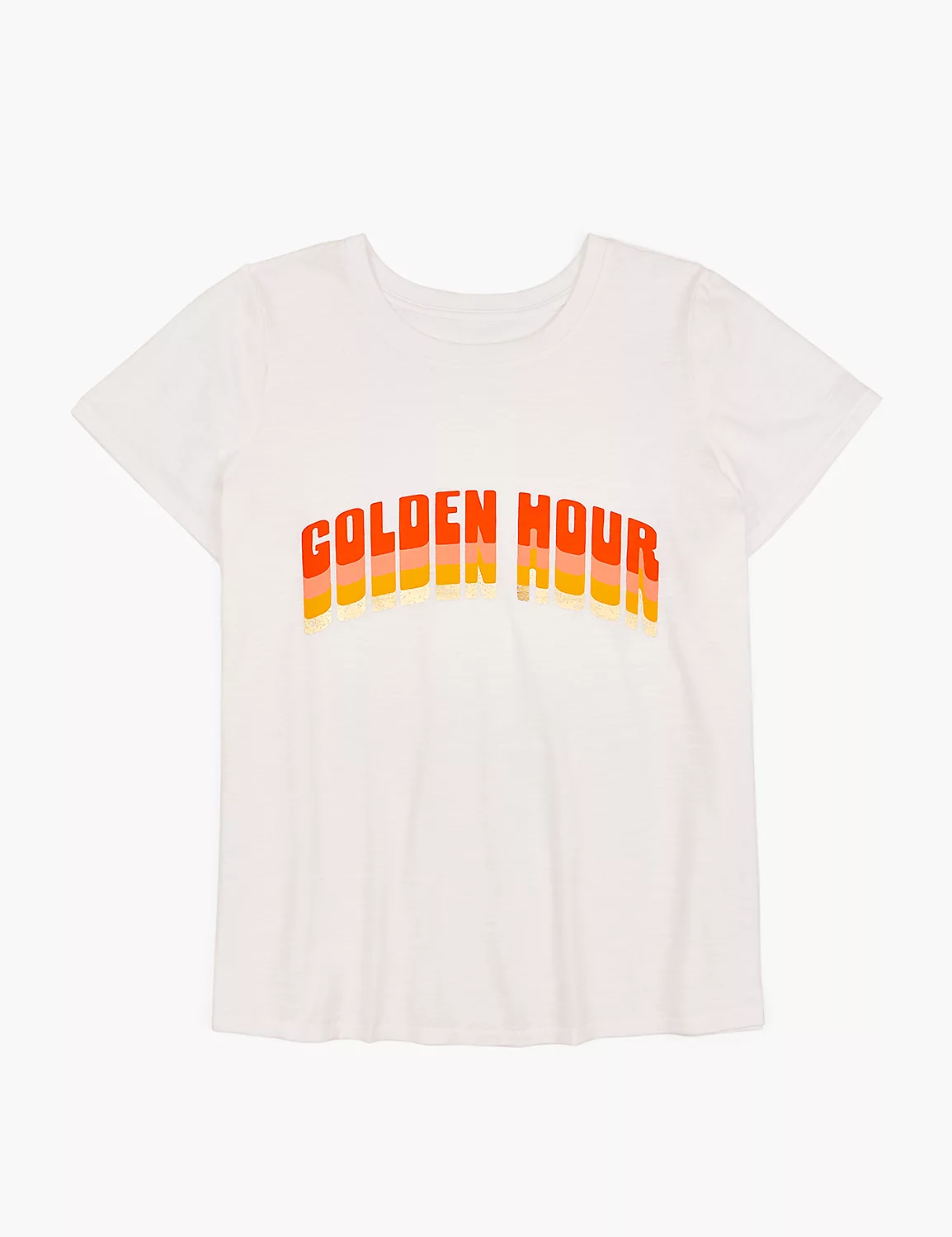 A time of day perfect for selfies and photo-ops, this soft, airy tee features a “golden hour” graphic with gold foil detailing.