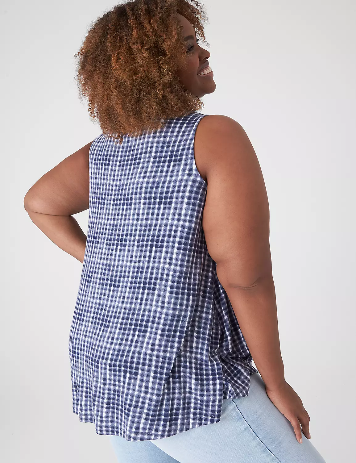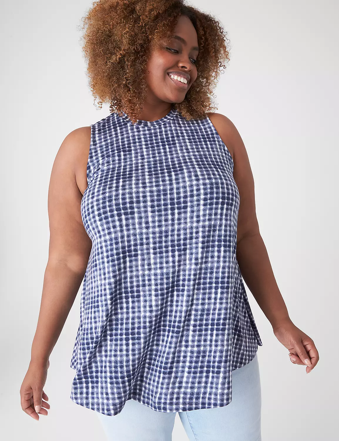 High neck. Sleeveless. Level hem. Slub jersey knit. Longer length is perfect for added coverage with skinny jeans and leggings. Available in Extended Lengths.