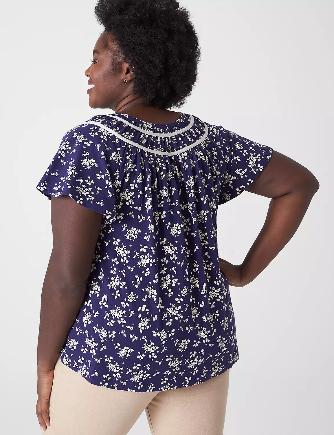 Everyday tee with sweet details — dainty buttons, shirring at the yoke and a darling pattern.