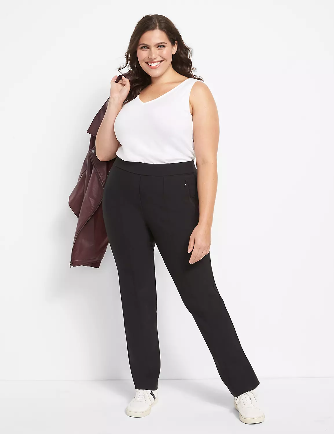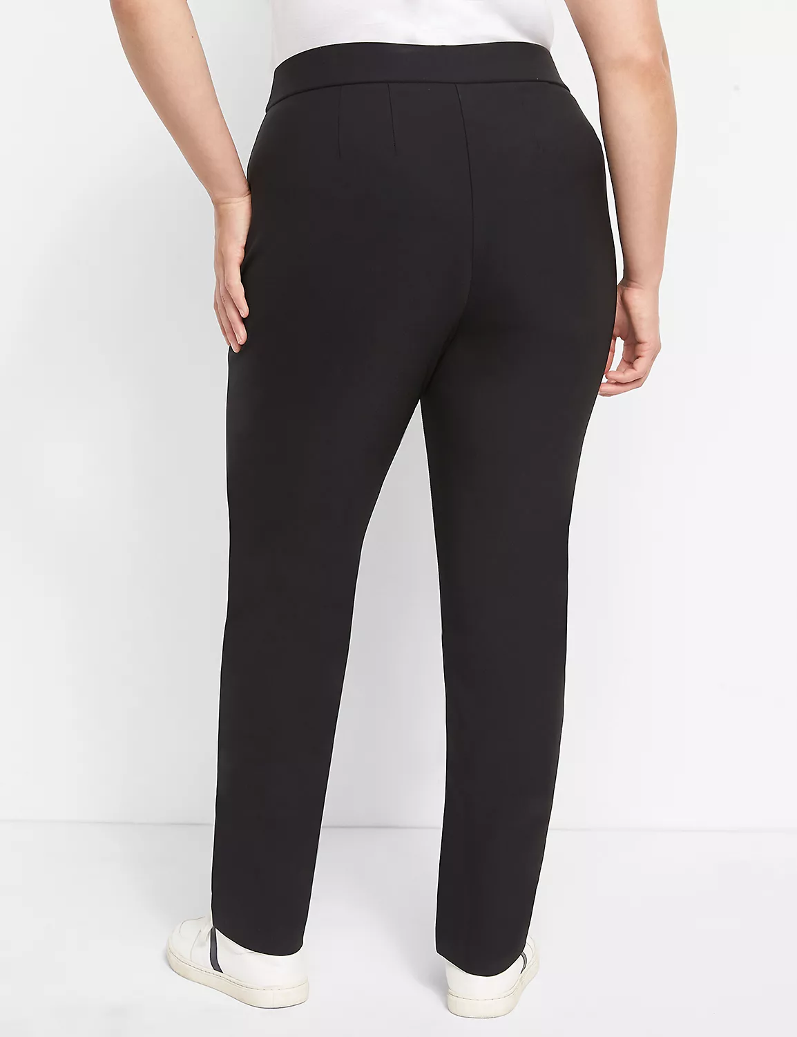 An On-The-Go straight pant now with a flattering center seam detail along the front! Featuring the same travel-ready, wrinkle-resistant fabric with easy pull-on styling (and enough stretch to keep you comfy all day long). The polished fit works on or off the clock thanks to the moves-with-you feel and sleek silhouette. Covered elastic pull-on waistband. Faux fly detail. Two side zip pockets. Side slit at hem.
