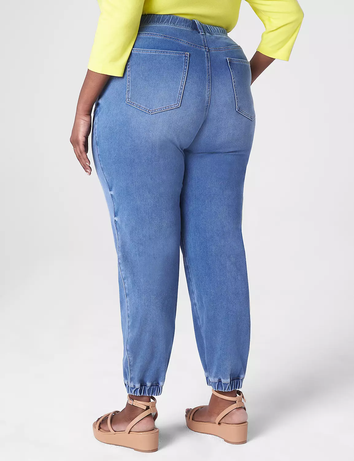 A pair of boyfriend jogger jeans with an easy pull-on waist. Borrowed-from-the-boys style never looked (and felt!) so comfy-chic. Belt loops. Pockets. Faux-fly. Fading and whiskering. Covered elastic waistband and hem.