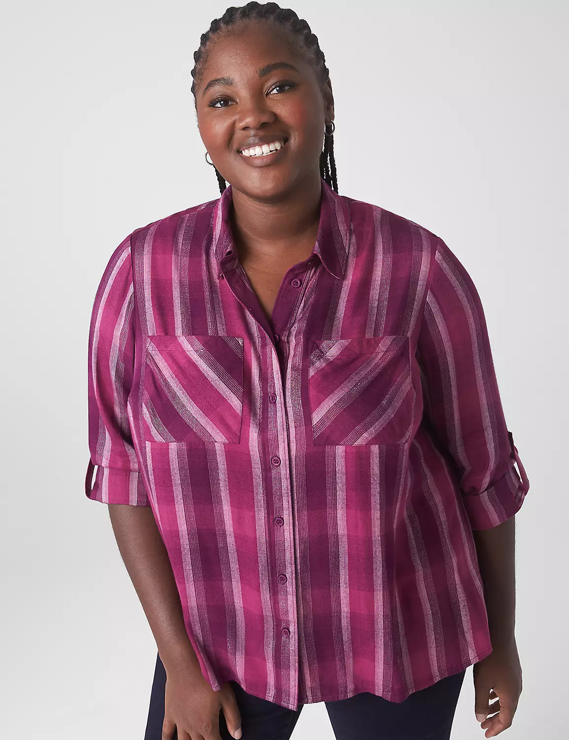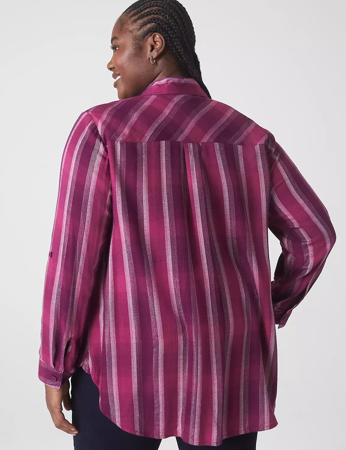 This relaxed fit boyfriend shirt with borrowed-from-the-boys style (and convertible sleeves!) proves why plaid and this season are a perfect match. Plus, metallic thread details for a gorgeous hint of shimmer.