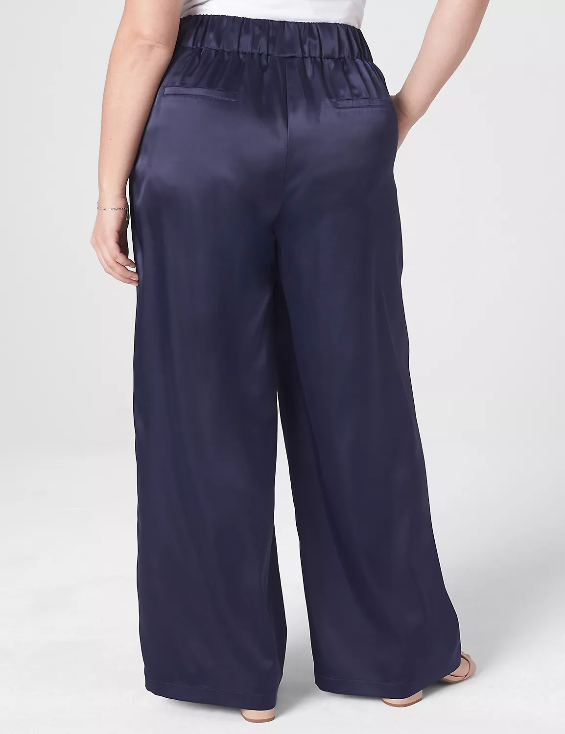 An ultra-chic and sleek pair of wide-leg pants with an elevated satin fabric and easy pull-on comfort. Covered elastic waistband. Pockets.