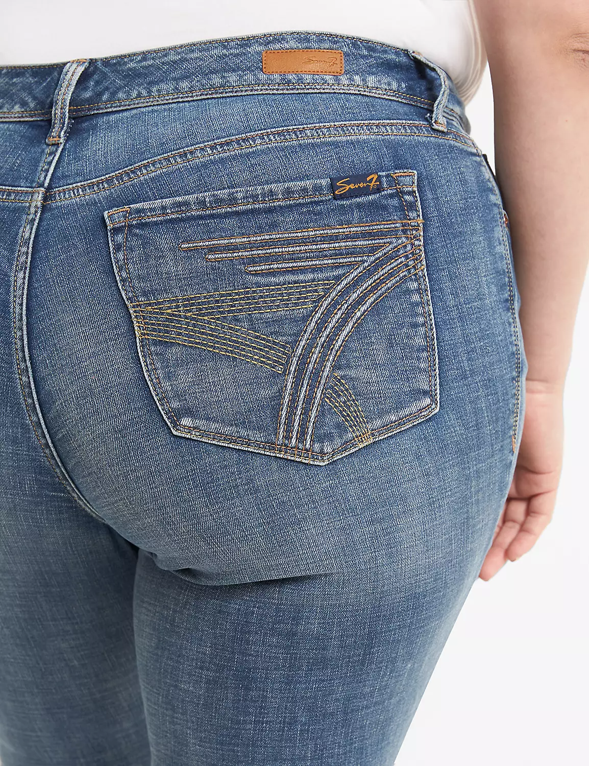 A classic, wear-anywhere-and-everywhere pair of Seven7 bootcut jeans in a perfect medium wash (plus iconic brand stitching on the back pockets, of course). Rose goldtone hardware. Subtle fading and whiskering detail. Belt loops. Five pockets. Button & zip fly closure.