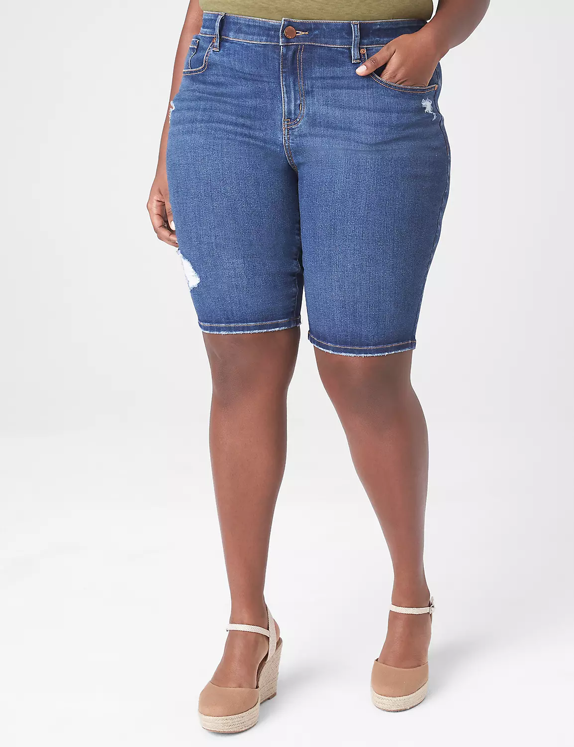 LEG SHAPE: Bermuda short. Slightly fitted from hip through thigh.