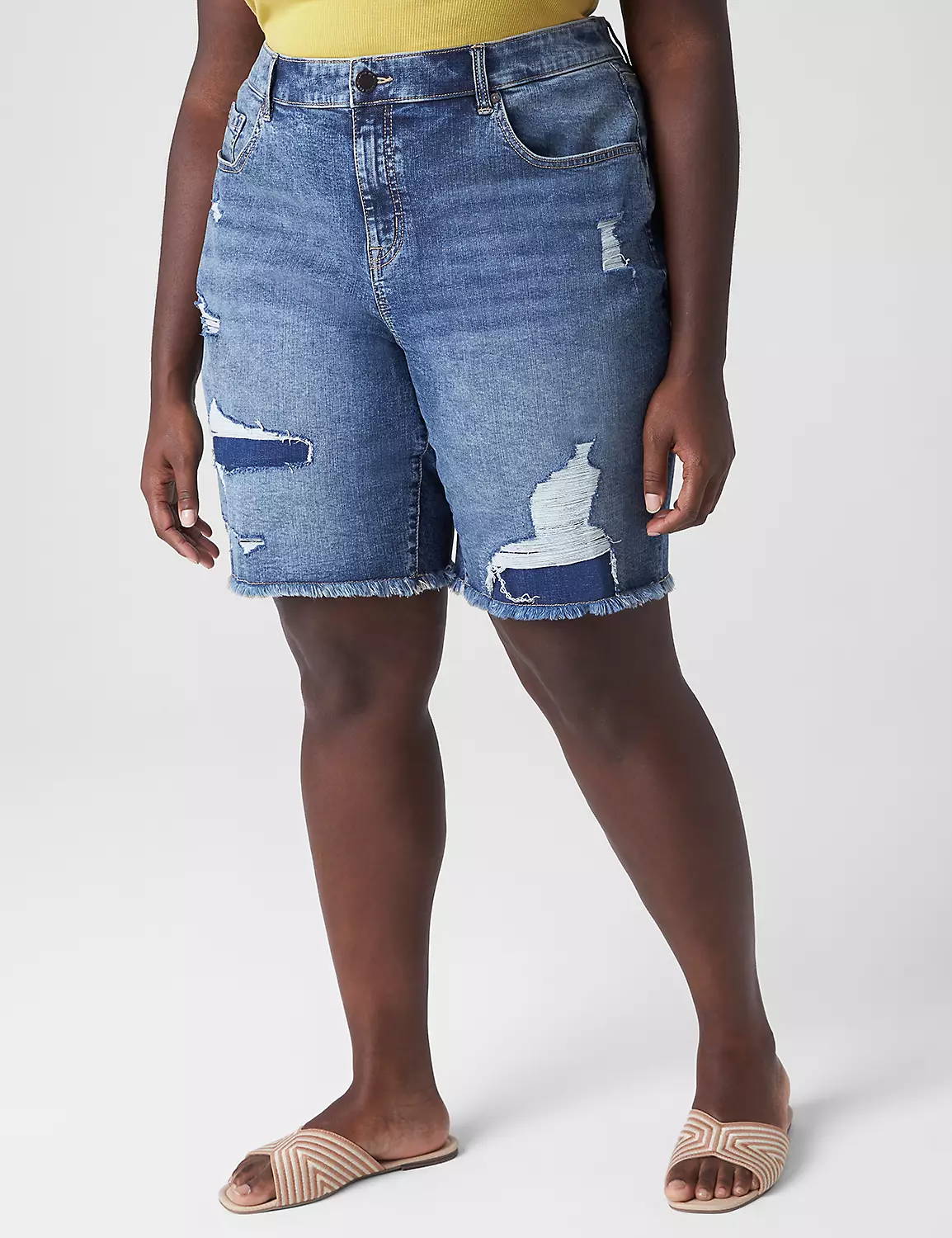Borrowed-from-the-boys style, made just for you. These boyfriend bermudas come in a goes-with-everything-wash. Destruction. Pockets. Fading and whiskering. Raw hem. Button and zip fly closure.