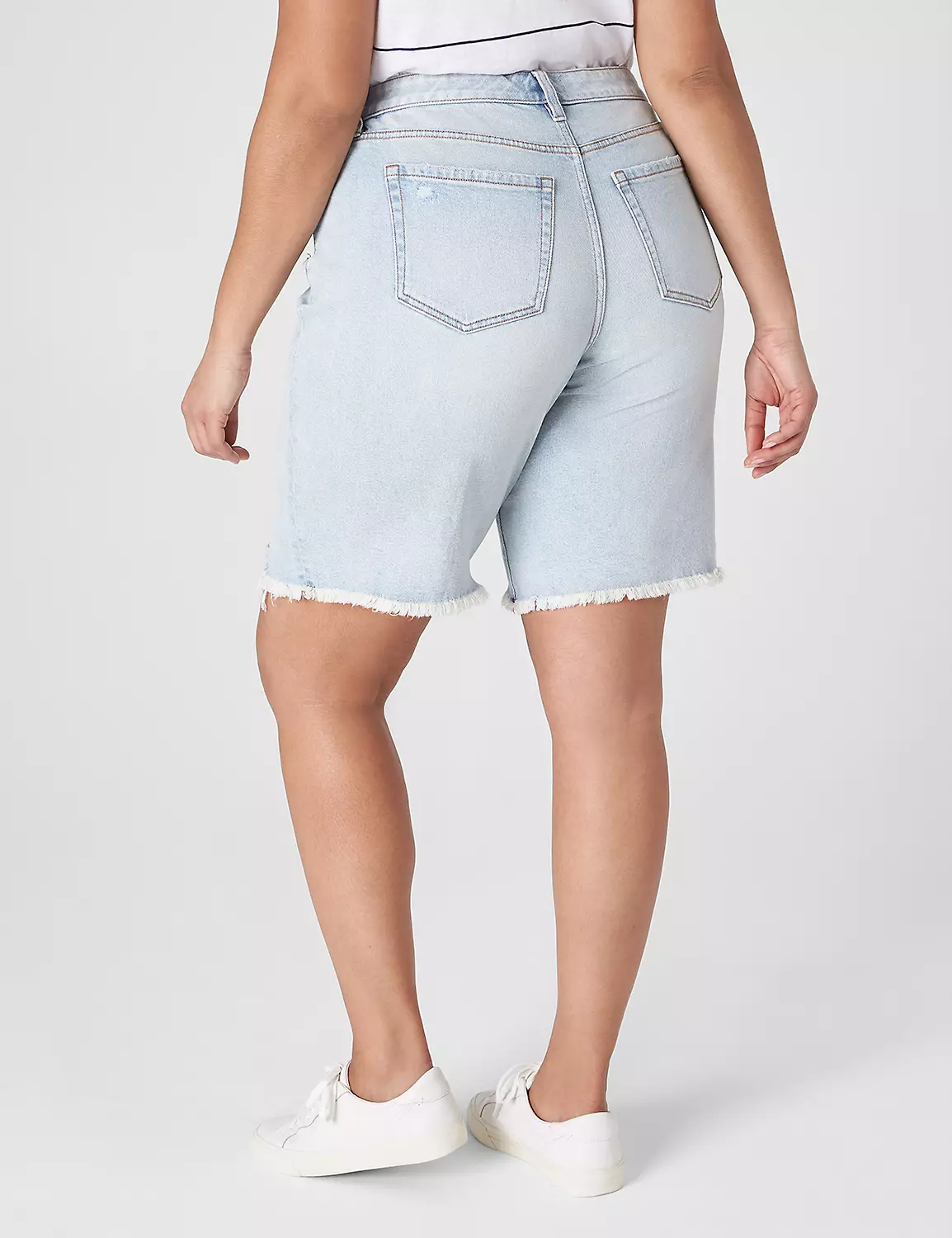 Borrowed-from-the-boys style, made just for you. This pair of bermuda jean shorts with a raw hem reminds us of endless summer days. Five pockets. Raw fray hem with destruction. Button and zip fly closure.