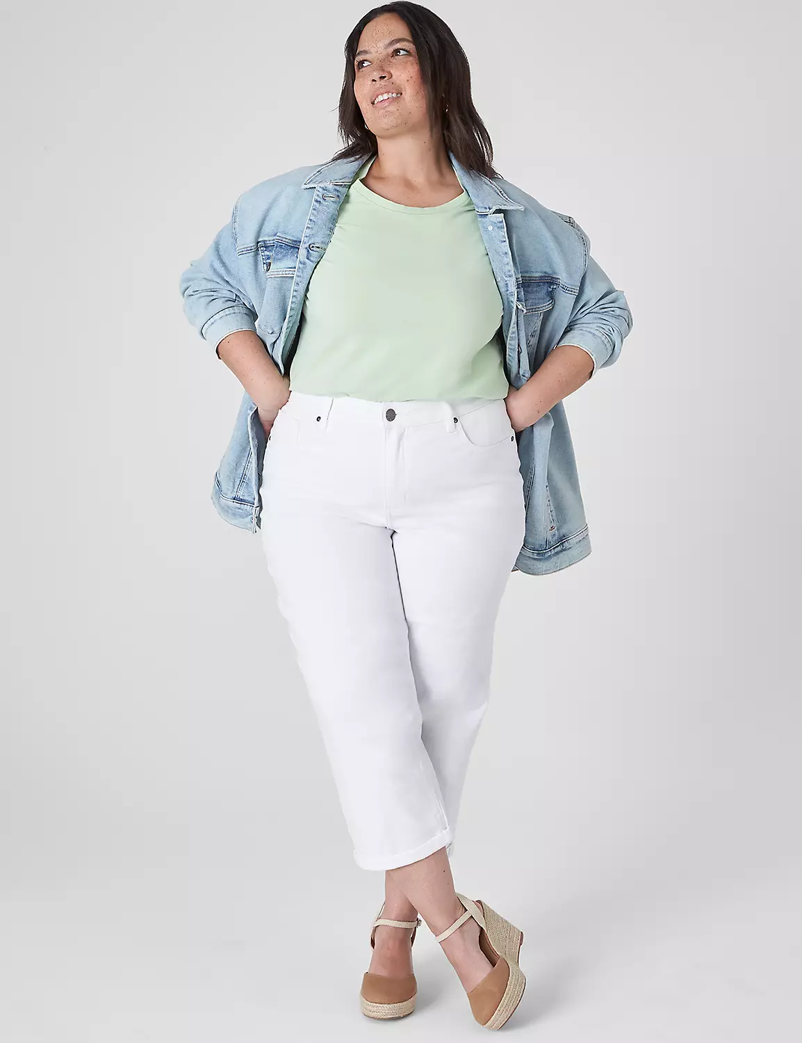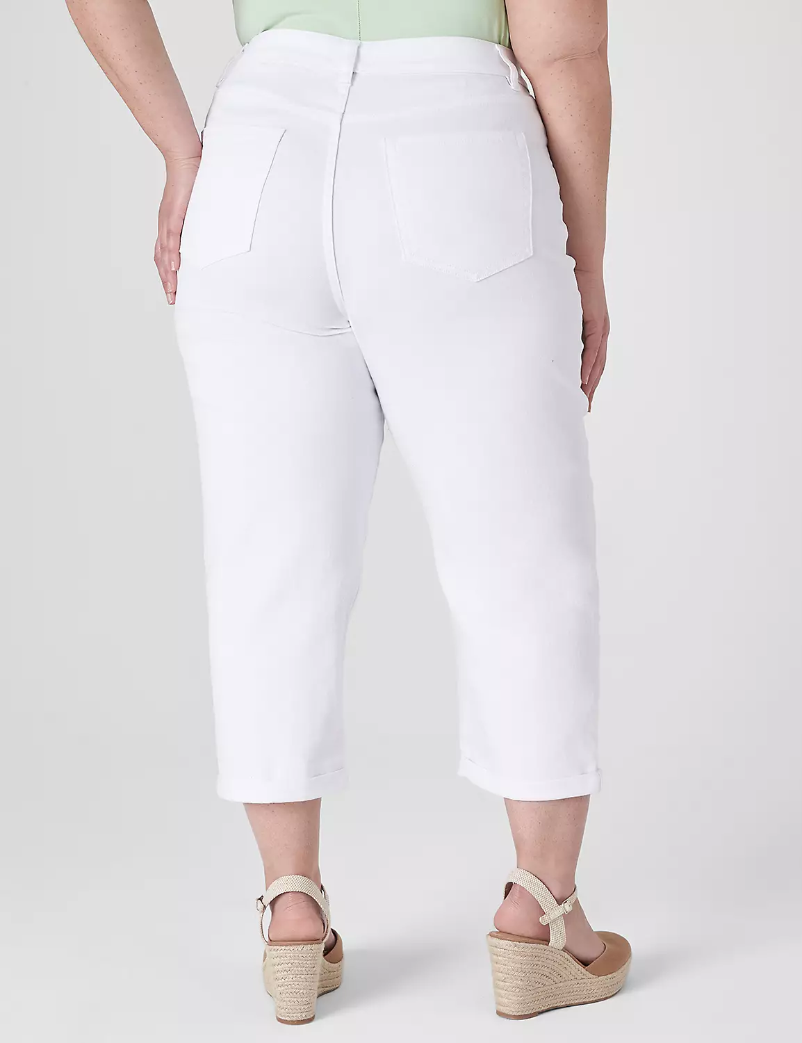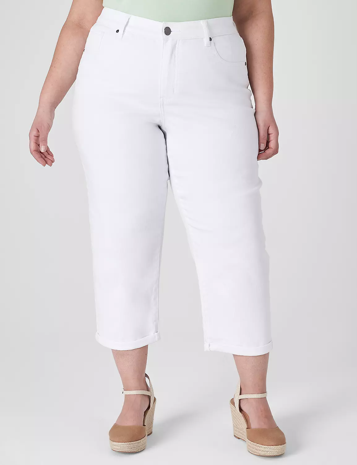 Fresh white denim meets a relaxed boyfriend capri silhouette that was made to show off alllll your cute shoes — from sneaks to heels. Five pockets. Rolled cuffs. Button and zip fly closure.