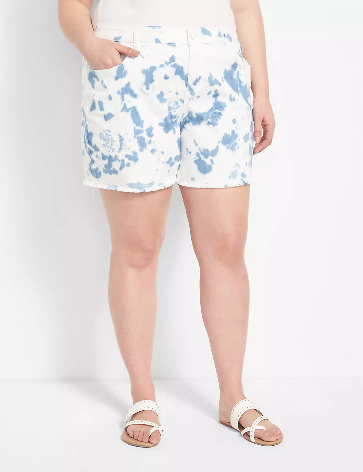 This pair of Signature Fit boyfriend midi shorts shows off a blue & white tie-dye print. Belt loops. Five pockets. Raw hem. Button & zip fly closure.