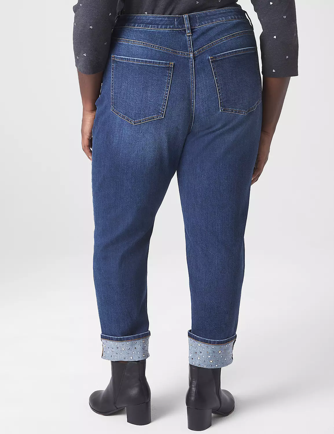 A pair of Signature Fit boyfriend jeans in a dark wash with a pop of personality at the ankles, thanks to the embellished cuffs. A cozy denim choice designed for all-day comfort. Belt loops. Five pockets.