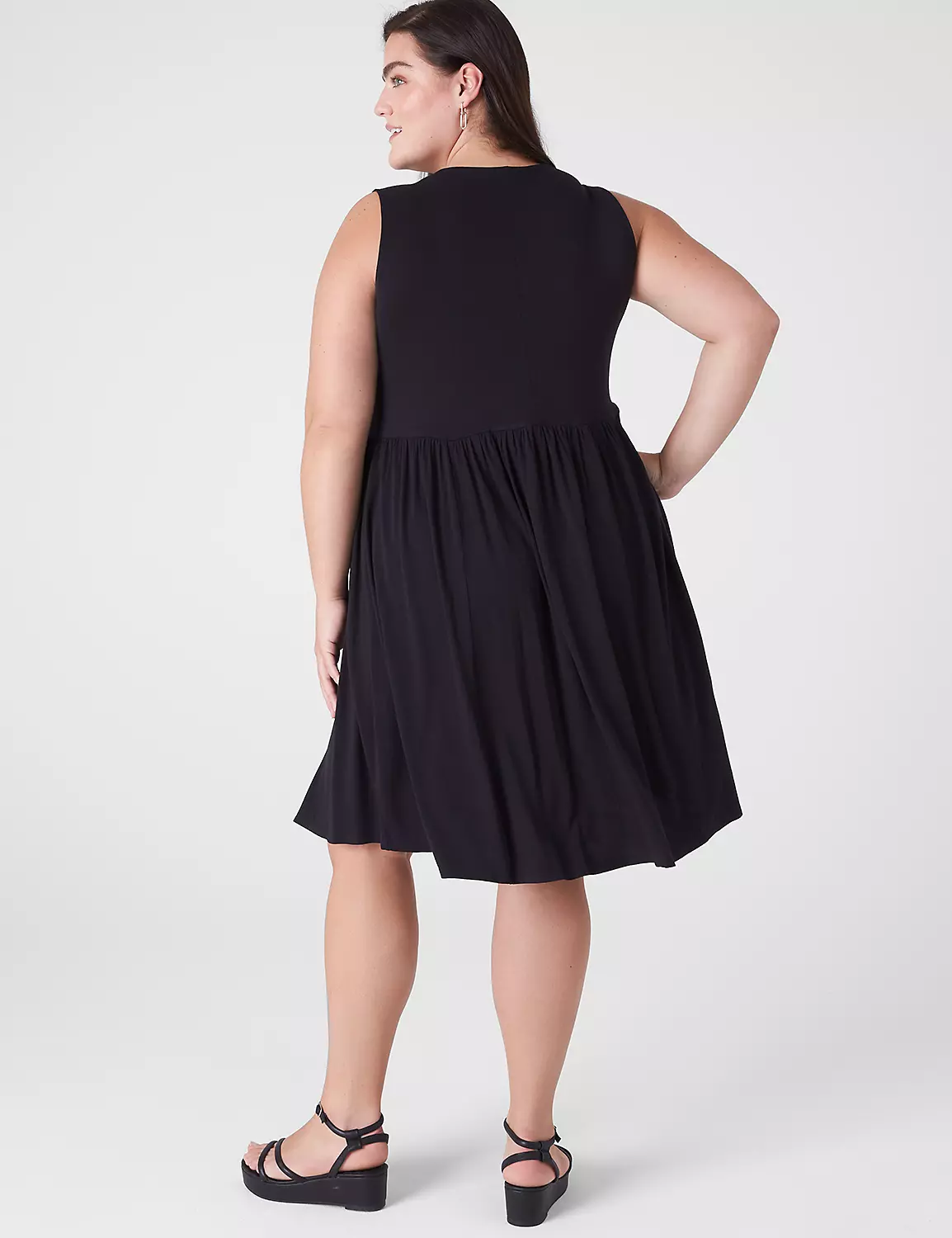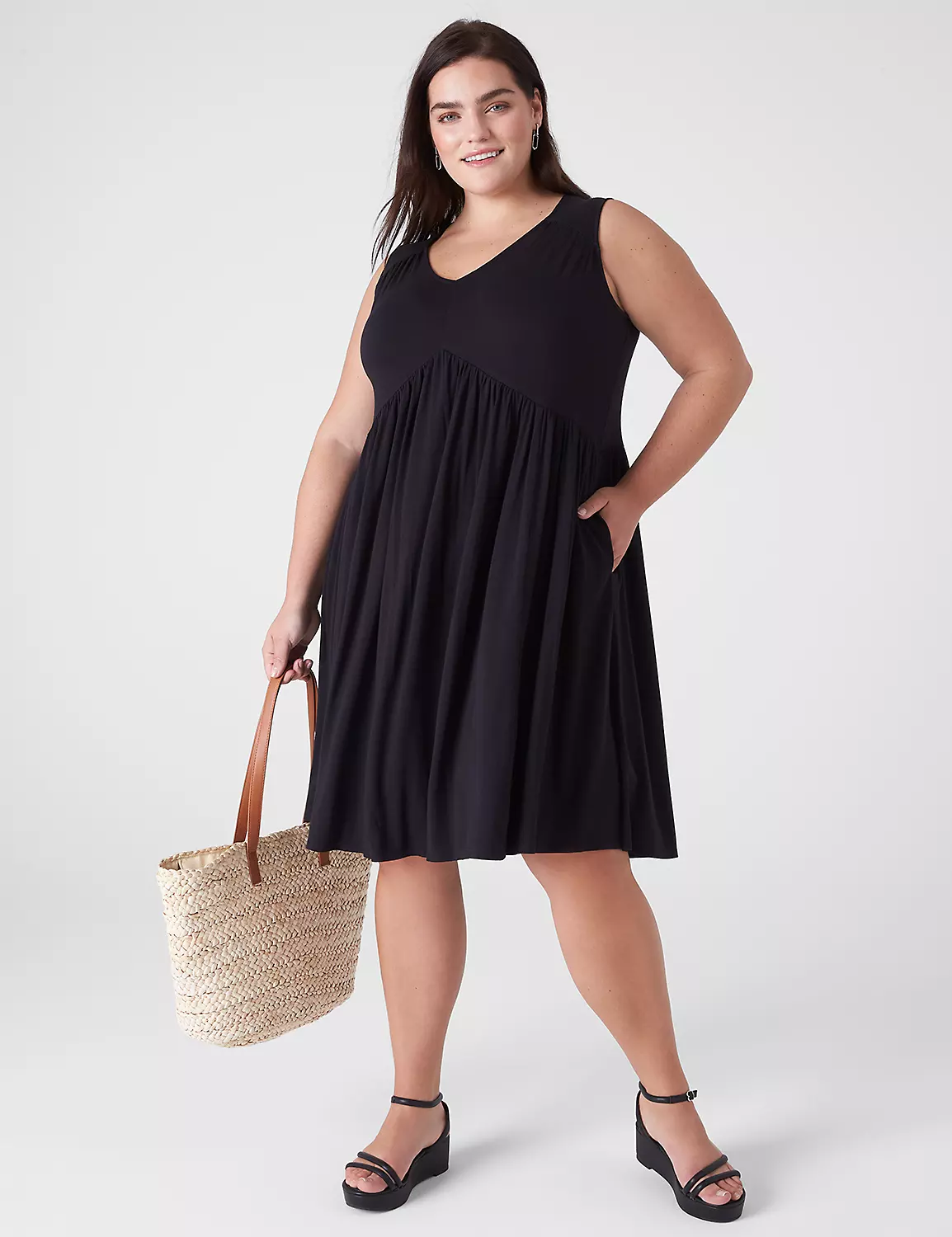 V-neck. Sleeveless. Pockets. Shirring on shoulder and at waist. Princess seams on skirt. Soft crepe fabric. No closure, pull-over style.