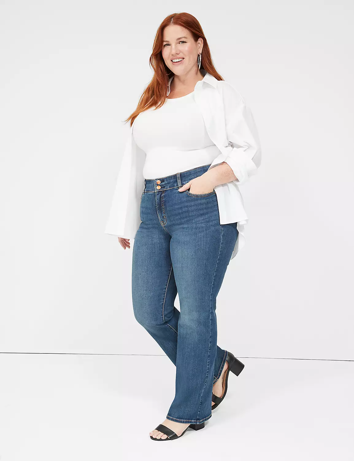 With this pair of medium wash high-rise boot jeans, the possibilities are endless — dress it up with a lace blouse or keep it casual with a graphic tee. Plus, the Tighter Tummy tech creates a smooth silhouette. Belt loops. Five pockets. Double-button and zip-fly closure.