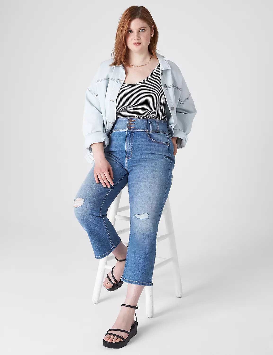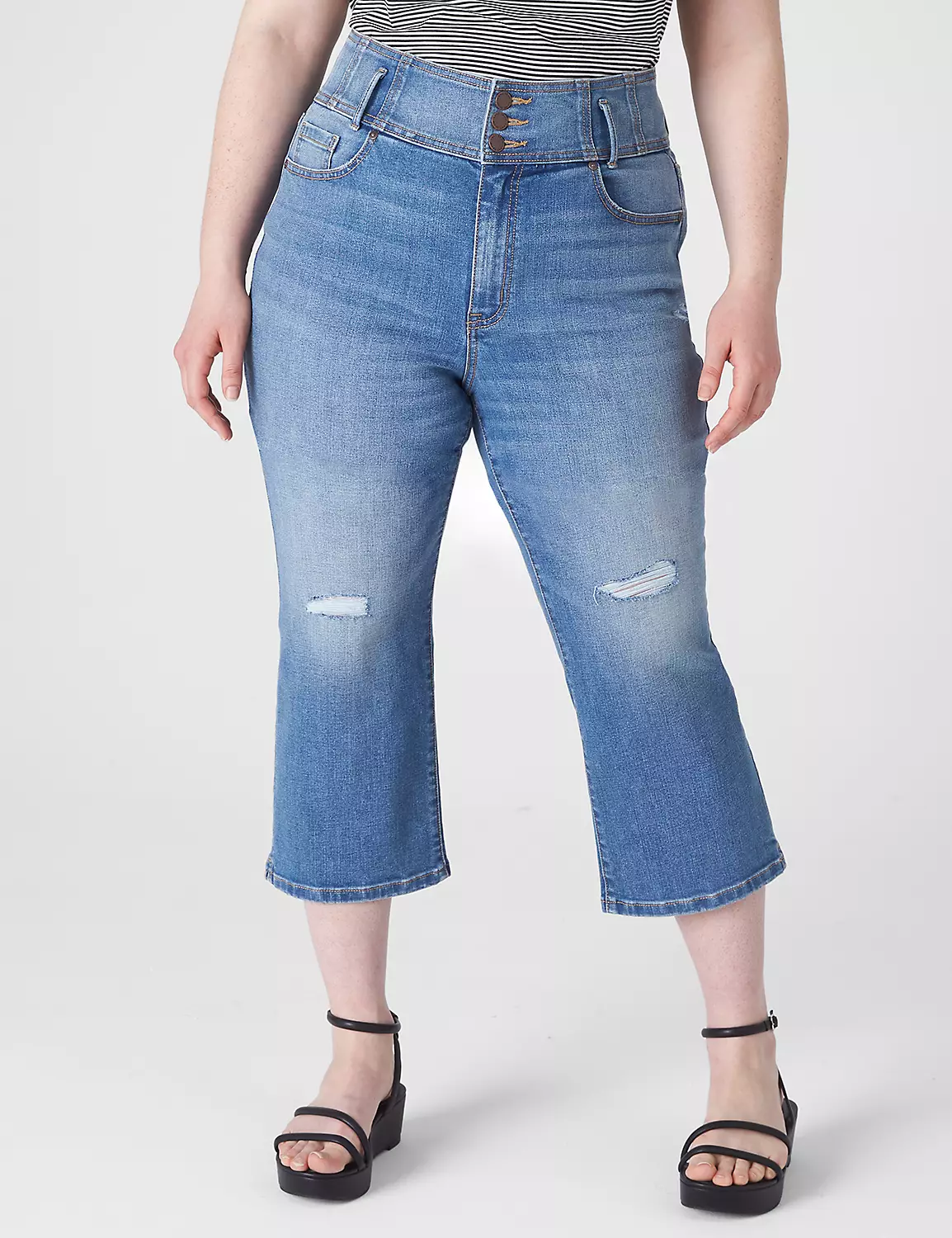 A pair of Ultra High-Rise straight leg capris with slight destruction — pairs well with cropped tops or a tucked-in tee moment. Wide corset-like waistband with seaming that shapes. Belt loops. Five pockets. Fading and whiskering. Triple-button & zip fly closure.